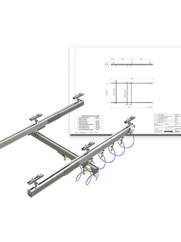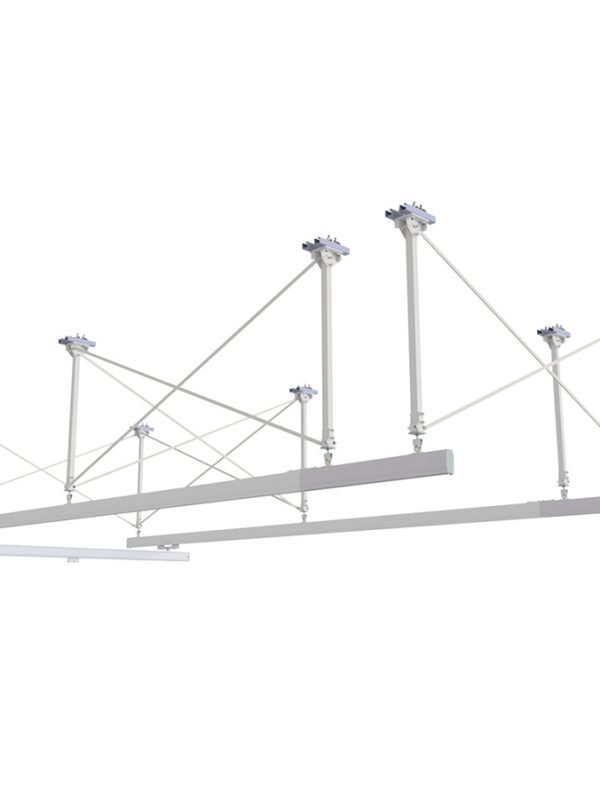 Movomech entwirft, fertigt und installiert wand- und deckenmontierte Tragkonstruktionen in unterschiedlichen Ausführungen, die jeweils auf die Einzigartigkeit der Räumlichkeiten und die beabsichtigte Handhabung basieren. Bei hohen Decken kann das Stahlsystem bis zu mehreren Metern von der Decke abgehängt werden.