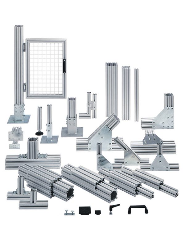 Konstruktionsprofile und StandardkomponentenAn allen Seiten jedes Profils verlaufen T-Schienen zur Montage von Zubehör. Alle Komponenten wie Montageplatten, Eckwinkel, Scharniere, Griffe, Schrauben und Muttern sind Standardartikel zur einfachen Montage.