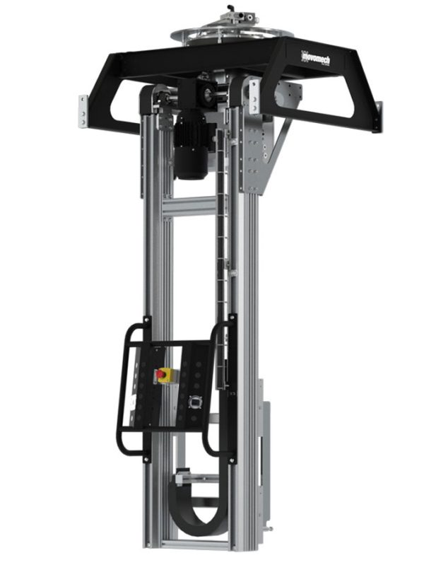 Der Mechstack Pro ist ein starker, elektrisch angetriebener Manipulator zur Handhabung und Abstapelung von Lasten bis zu 650 kg und Momenten bis zu 4.000 Nm. Der Hubbereich dieser Anlage beträgt bis zu fast 5 Meter und die Hubgeschwindigkeit wird über einen Joystick synchron und feinfühlig gesteuert. Die Simplex-Antriebsketten, die die Antriebsachse mit den Wagen verbinden, sind in den Aluminiumprofilen gut geschützt.